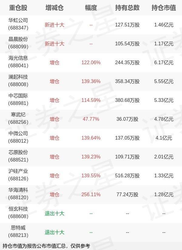 证券之星讯息,10月28日汇添富基金旗下孙浩处理的汇添富上证科创板芯片交游型绽开式指数基金公布三季报。与上一季度比较,该基金前十大重仓股新增华虹公司,晶晨股份;并对海光信息增仓134.31万股,为该基金第一大重仓股;恒玄科技,念念特威等退出前十大重仓股;审视数据如下: