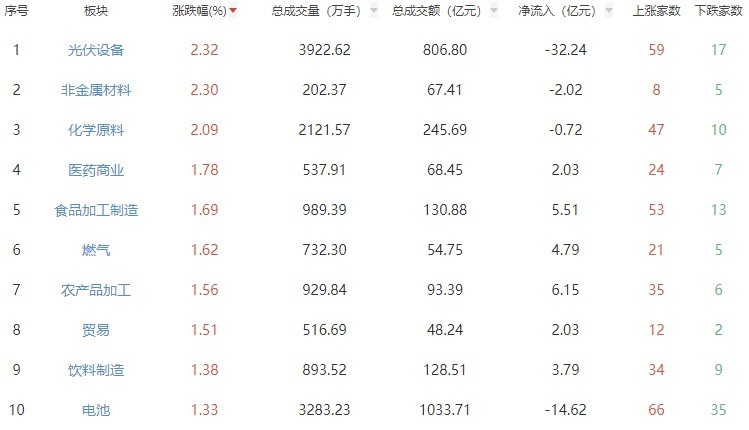 板块方面,光伏拓荒、非金属材料、化学原料等板块涨幅居前,保障、元件、软件拓荒等板块跌幅居前。