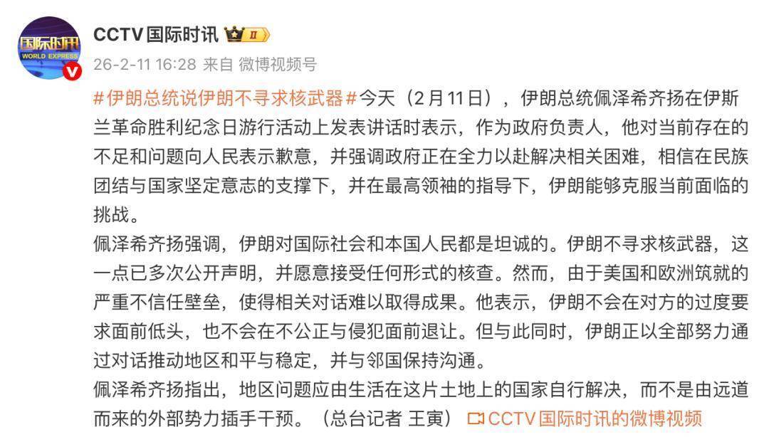 2月11日,伊朗总统佩泽希皆扬在伊斯兰立异告捷系念日游行行为上发表谈话时暗示,手脚政府认真东谈主,他对现时存在的不及和问题向东谈主民暗示歉意,并强调政府正在任重道远惩处筹议防碍,驯服在民族配合与国度坚强融会的支捏下,并在最高首级的疏导下,伊朗好像克服现时边临的挑战。 ![]() 当地时辰2月11日,佩泽希皆扬在伊斯兰立异告捷系念日游行行为上发表谈话。图自外媒 佩泽希皆扬强调,伊朗对海外社会和本国东谈主民都是坦诚的。伊朗不寻求核火器,这小数已屡次公开声明,并粗鲁收受任何方式的核查。但是,由于好意思国和欧洲筑就的严重不信任壁垒,使得筹议对话难以赢得甩掉。他暗示,伊朗不会在对方的过度条目眼前折腰,也不会在不公道与滋扰眼前驻防。但与此同期,伊朗正以沿路勉力通过对话鼓吹地区和平与踏实,并与邻国保捏通常。 佩泽希皆扬指出,地区问题应由生存在这片地皮上的国度自行惩处,而不是由远谈而来的外部势力进入打扰。 ![]()